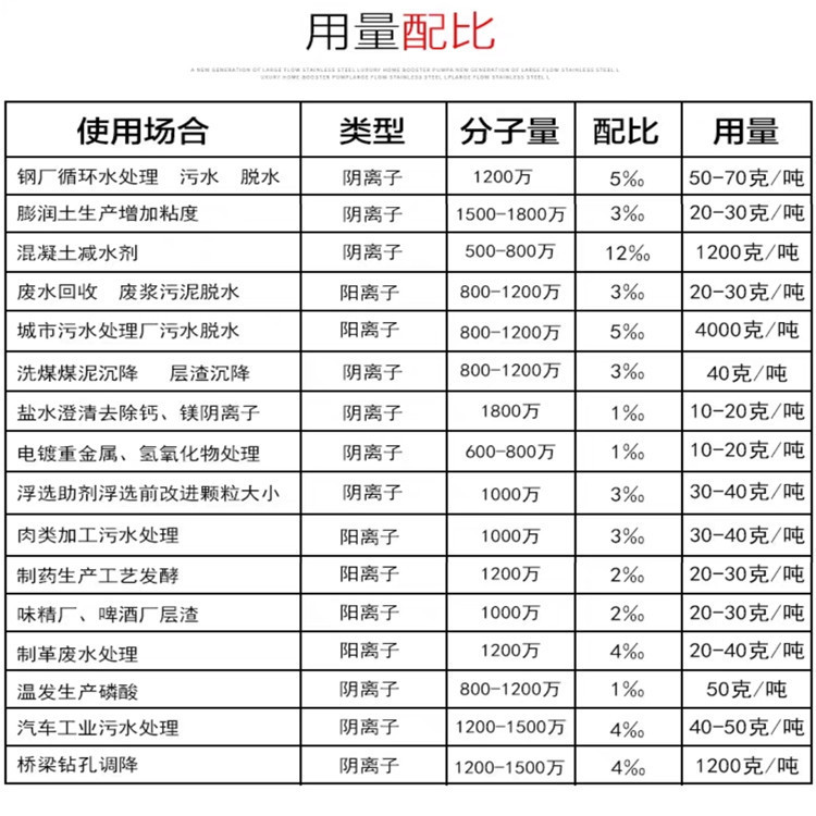 下面是陰陽離子聚丙烯酰胺的用量配比表,供新老客戶參考!